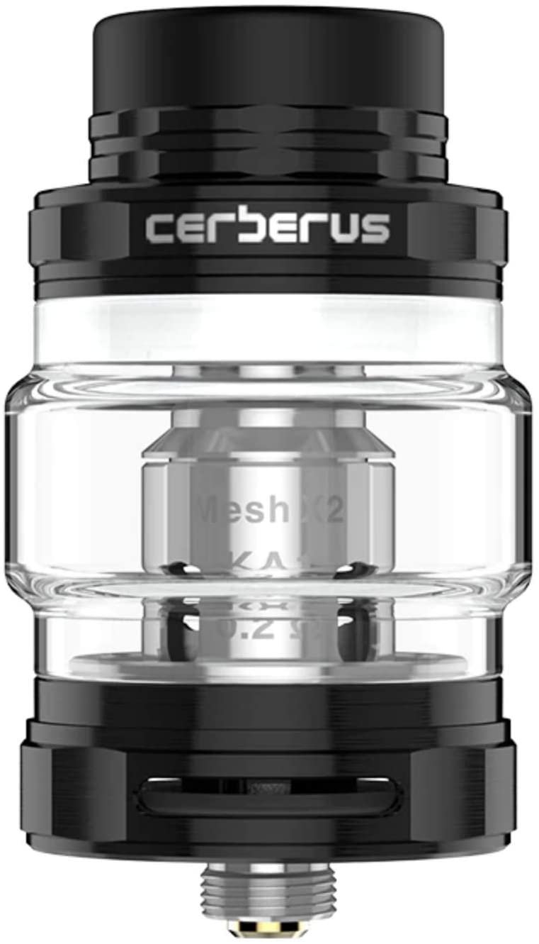 The Geek Vape Cerberus 25mm Sub-Ohm Tank is well-designed, featuring an innovative threaded top fill system, dual adjustable bottom airflow ring, and a new coil system featuring Super Mesh Coils. The Cerberus Sub-Ohm tank measures in at 25mm at the base, but increases to 27mm at the widest point using the included bubble glass expansion to upgrade the juice capacity from 4mL to 5.5mL. The Cerberus Sub-Ohm tank hosts an innovative top fill system, accessible by rotating the knurled and threaded top cap to reveal an oversized fill port. At the other end, the Cerberus has an adjustable dual-slotted bottom airflow ring to control the inlet of air to create conditions conducive to vapor or flavor production. The Cerberus Sub-Ohm tank is able to access the Super Mesh Coil Line, utilizing offerings like the X1 coil, best rated for 60-80W.