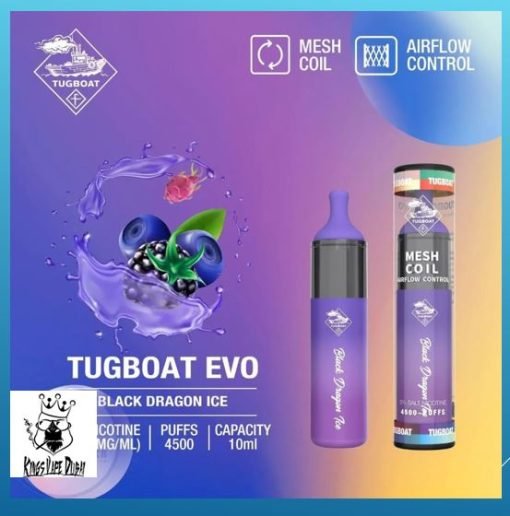 Tugboat Evo Black Dragon IcePUFFS 4500- smooth overtones are accompanied by a Dragon fruit blast to refresh the senses and chill the throat